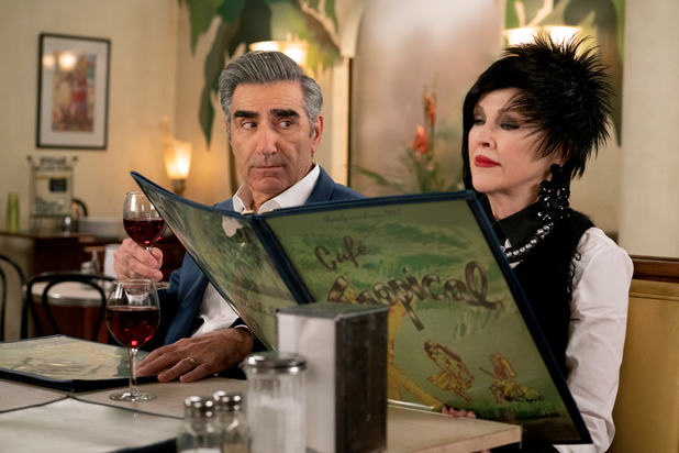1) “Schitt’s Creek,” 4-11 p.m., Pop. It took five years for this oft-clever show to get attention. Now “Schitt’s Creek” has Emmy nominations for best comedy and for its costumes and stars, Eugene Levy and Catherine O’Hara (shown here); TV Guide named it the best current show. It’s not THAT good, but it is above average, with a once-rich family settling for life in the tattered town it once bought. The sixth and final season starts in January; here’s the fifth, starting with O’Hara’s awful horror movie.